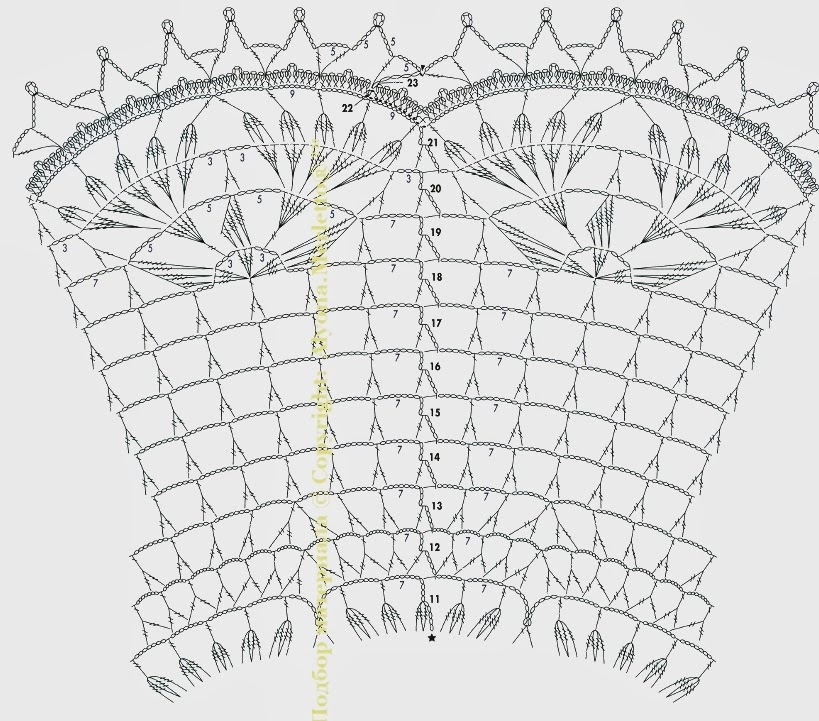 7-й р.. кром. п., *1 изн. п., 1 лиц. п.* повт. от * до * 1 изн. п., кром. п. 8-й р.. вяз. по рисунку. Далее повт. 1-9-й р.