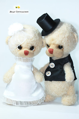 Хочу Вас познакомиться с парой влюбленных мишек, которые женятся))) Имена я им не придумывала, так как они поедут поздравлять молодоженов, вот они им и дадут имена. Мишек делала как обычно, кроме одежды... я её сшила :)