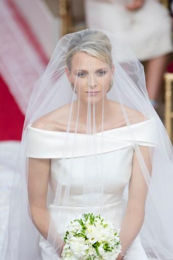 Платье Шарлен изыскано в своей кажущейся простоте: строгое, сшитое по фигуре и слегка расклешенное книзу. Верх платья украшен декольте. На голове невесты нет головного убора или тиары, как принято у принцесс. Вместо этого прическу Шарлен украшает сзади большая драгоценная заколка в виде цветов, она же держит фату невесты. Единственным спорным моментом в платье является очень длинный двойной шлейф платья, который явно мешал Шарлен свободно идти вперед, к алтарю. Было видно, что княгине каждый шаг дается не совсем легко. Венчальный наряд был создан любимым Шарлен дизайнерским домом Джорджо Армани, услугами которого новоиспеченная княгиня Монако пользуется с завидной регулярностью. Лицо невесты покрывала объемная фата.
