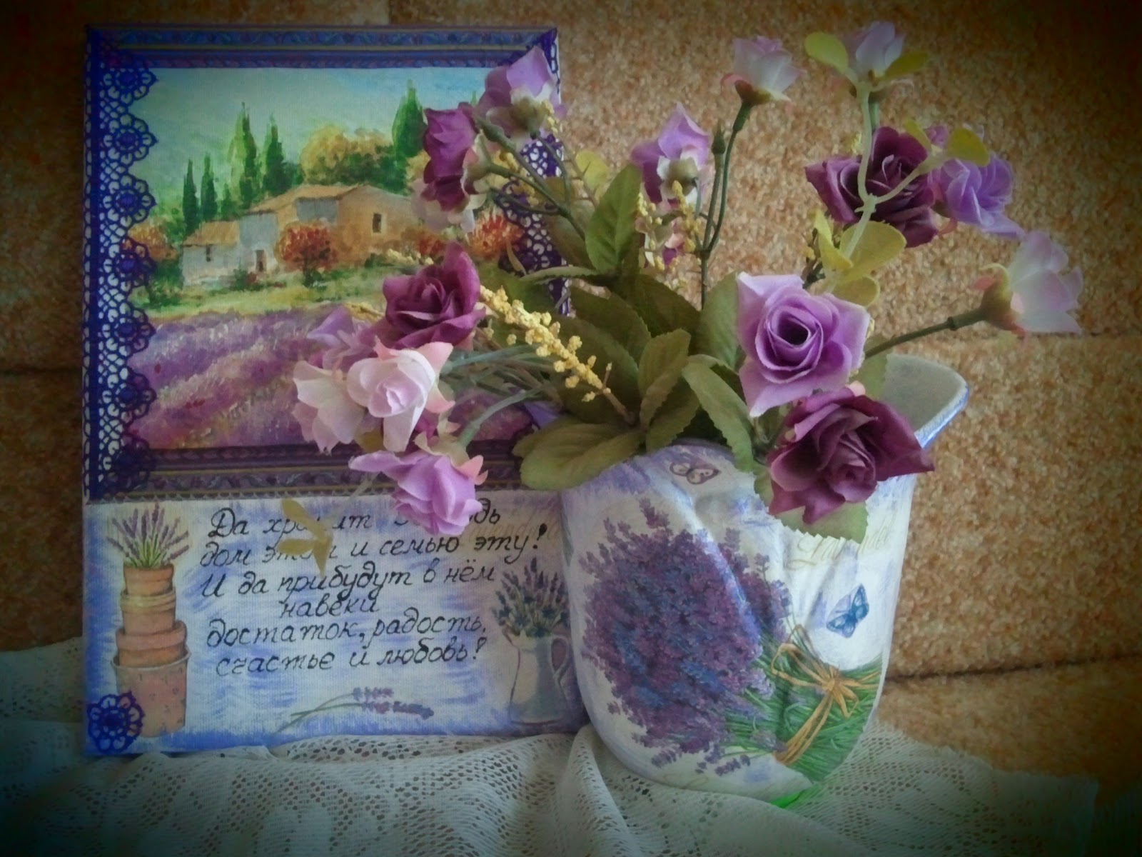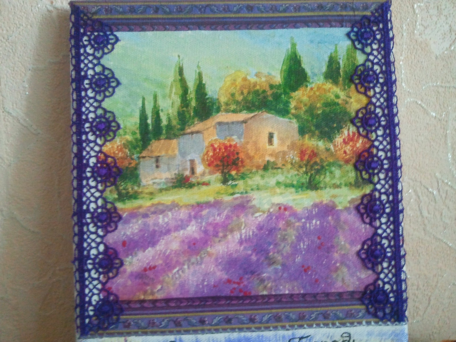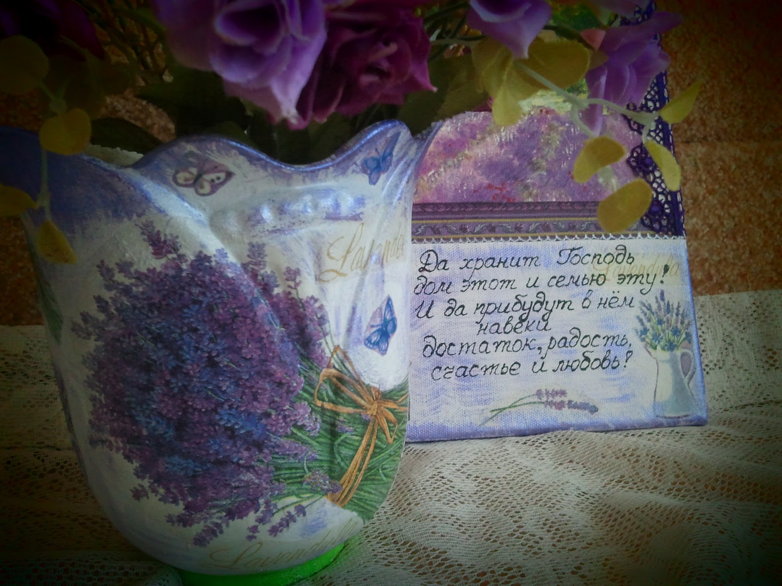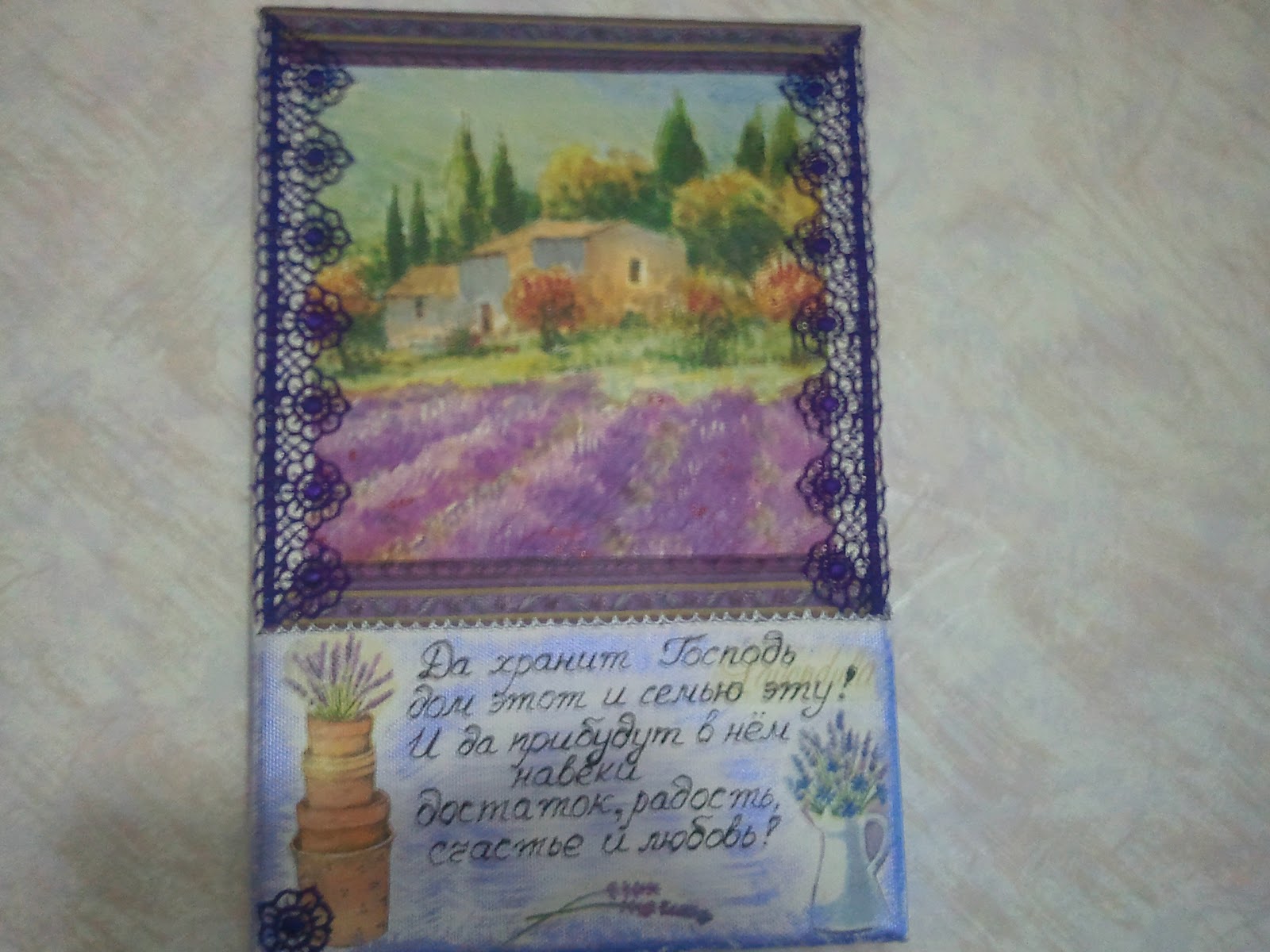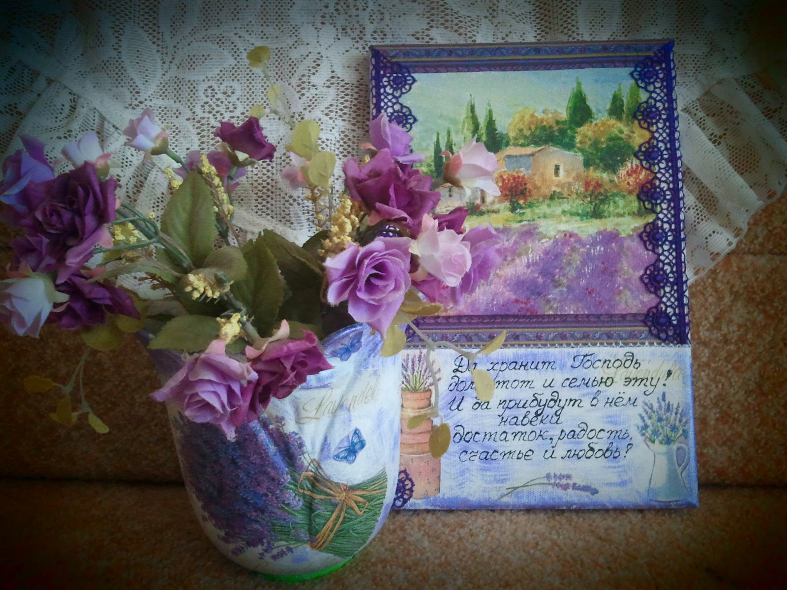 Переделала старый облезлый глиняный цветочный горшок. Пока делала горшок, пришла идея , как доделать панно на холсте. Оно лежало недоделанное полгода, никак не могла придумать как дополнить декупаж с лавандовым пейзажем в верхней части холста. Когда-то попалась эта салфетка. Так она мне понравилась, это же дом моей мечты: дом, кипарисы, лавандовое поле рядом.... м-м-м-м...