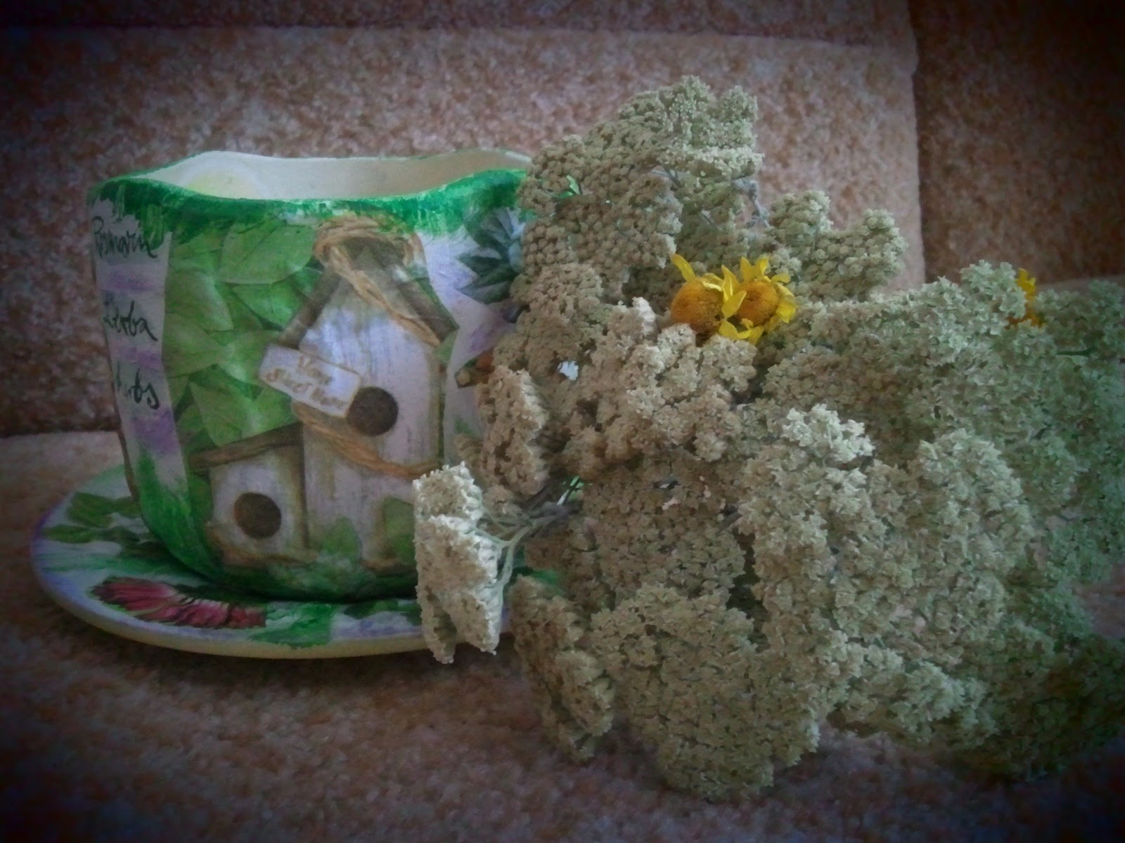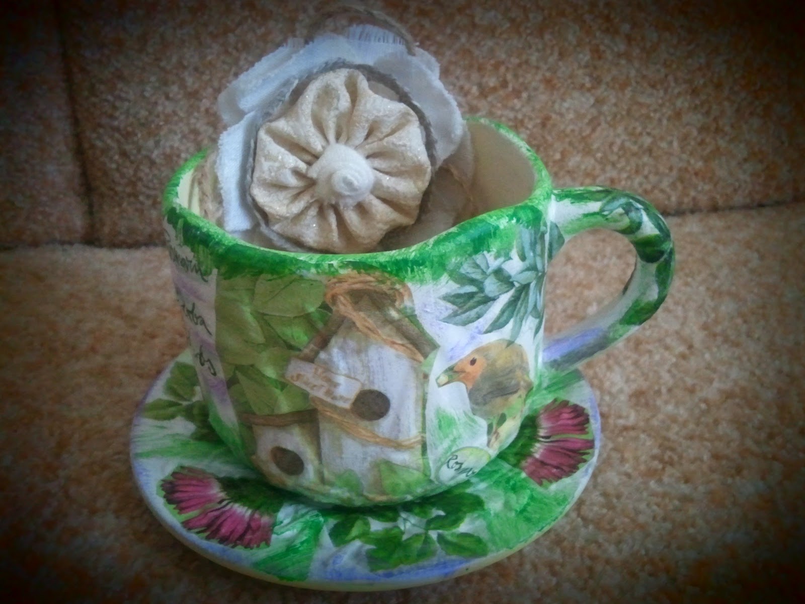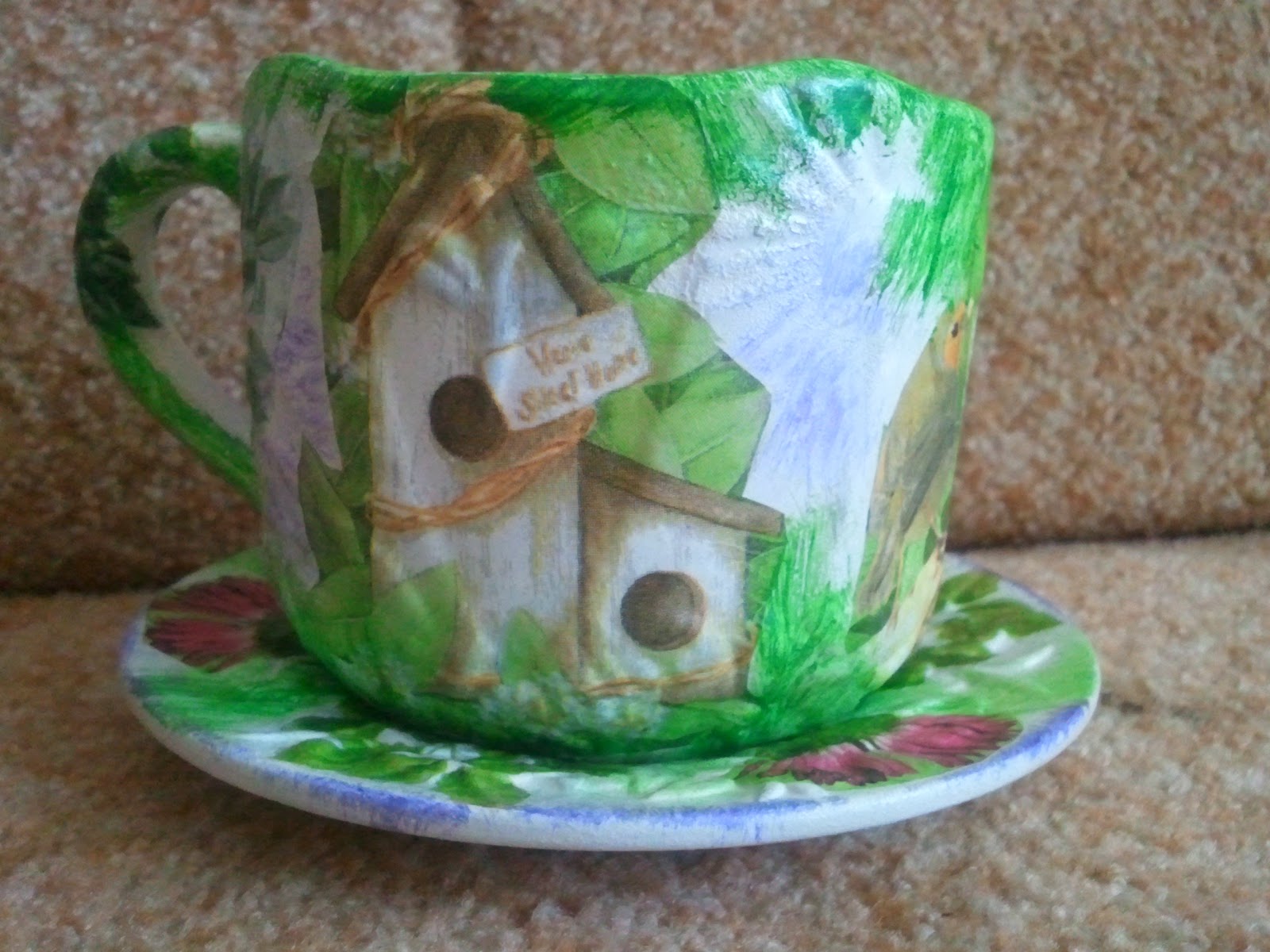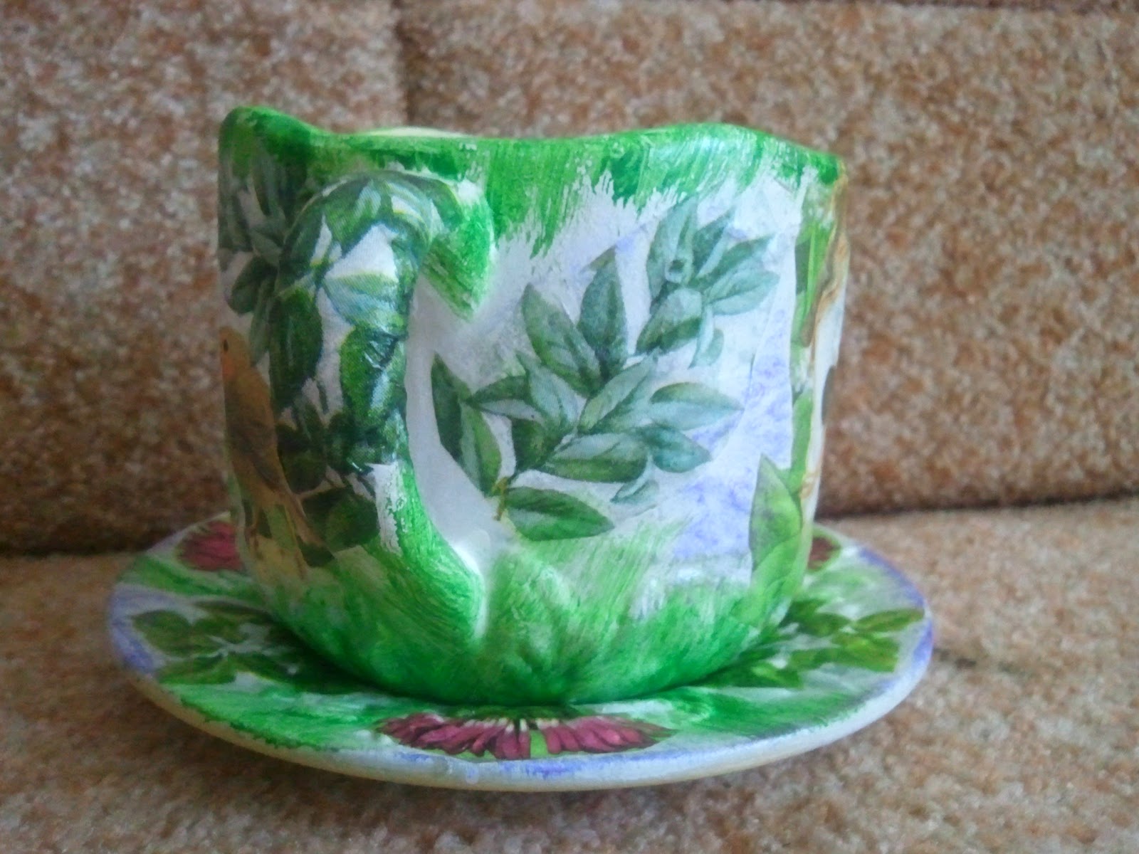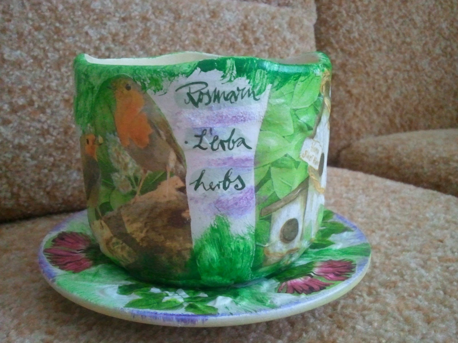 Помните, лет 5 назад(может меньше, точно не помню) были акционные наборы "Липтон": пачка чая + горшок в виде чашки и блюдца? Со временем горшочек обтрепался, облез... Поэтому было решено дать ему вторую жизнь!