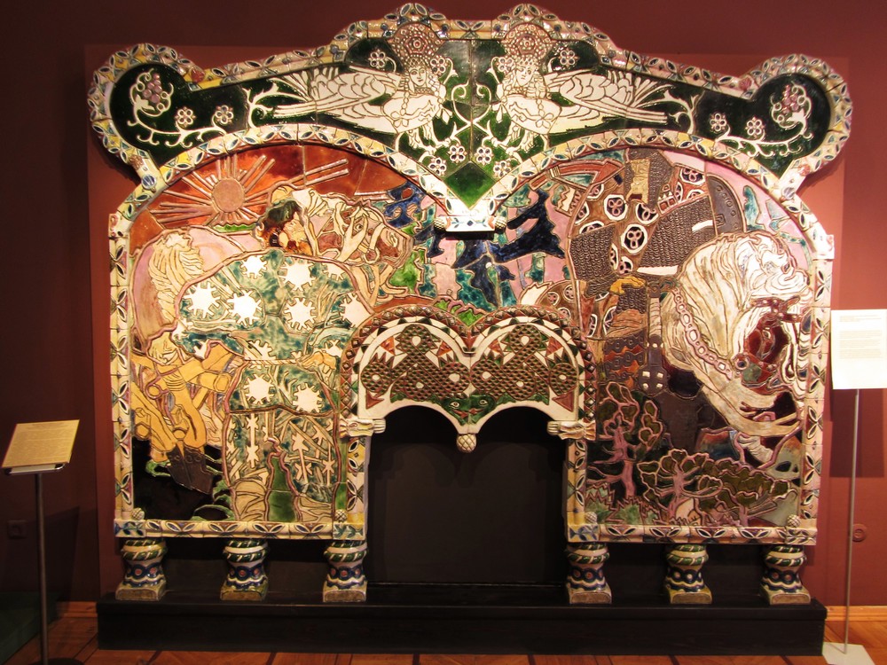 Это камин. Точнее, керамическая облицовка для каминного портала. Проект Михаила Врубеля (да-да, того самого). В 1900 году камин поехал на Всемирную художественно-промышленную выставку в Париж и выиграл там золотую медаль. Ещё бы он её не выиграл!