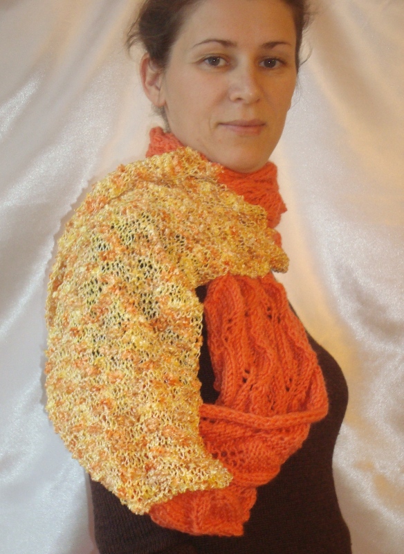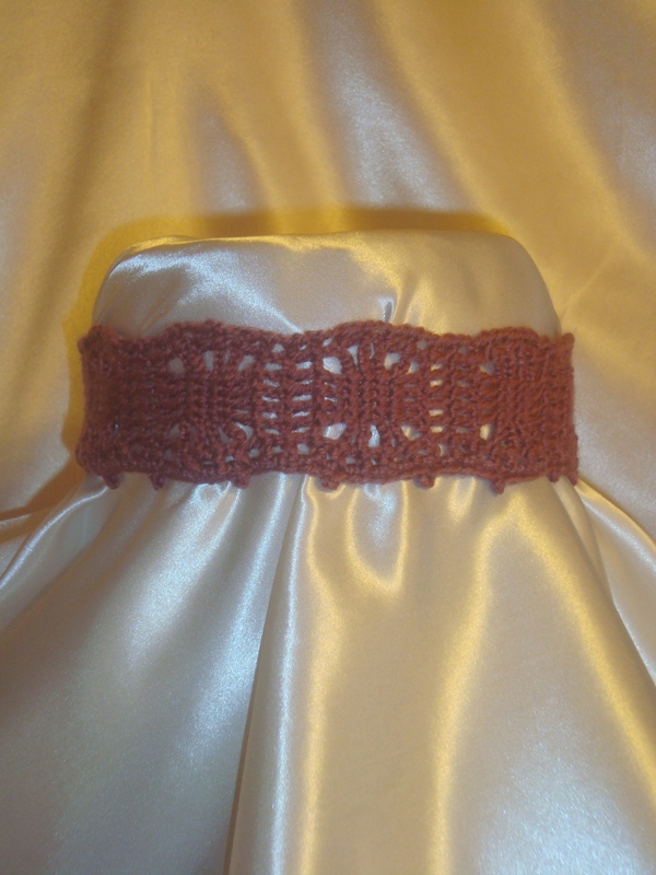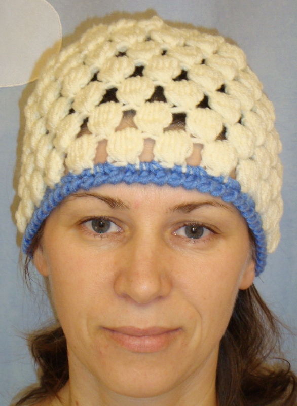 Шапочка выполнена спицами, не имеет швов. Закрывает шею. Трикотажный подклад из искусственного короткого меха пришит вручную. Цветочек выполнен на тенерифе и декорирован биссером, к ушкам прикреплены кисточки. ОГ49.