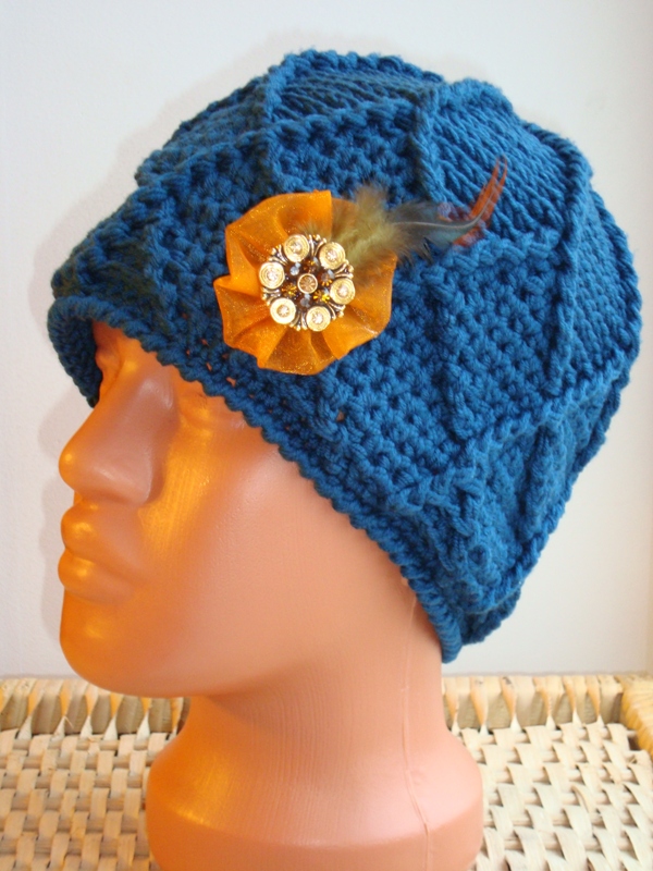 Шапочка выполнена из итальянской мериносовой шерсти крючком, не имеет швов. Теплая, не колючая совсем. Шапочка имеет глубокий бирюзовый цвет. Декорирована съемной брошкой ручной работы.