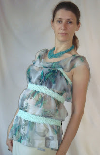 Топ скомбиниован из ткани и пряжи. Использована: Ткань - шифон, края обработаны зигзагом, пряжа - буклированый акрил. На стыке полос ввязана нитка-резинка.