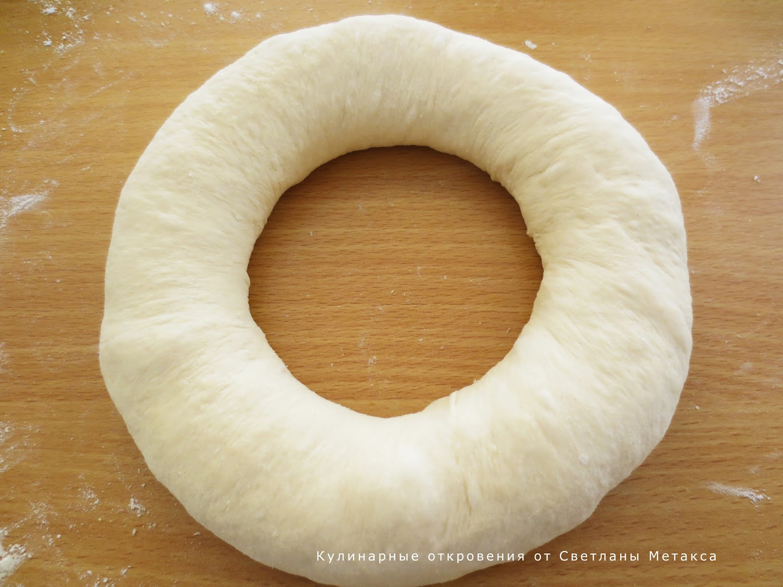 3.Из каждой части сформировать кольцо. Сначала в середине делаем дырку и затем растягивая на весу формируем кольцо. Посыпаем сверху мукой и накрываем полотенцем, оставляем на 30 минут.