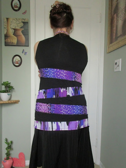 Потом разрезала чёрную майку во всех возможных направлениях,вставила ленты между разрезами и обметала оверлогом по лицевой стороне.