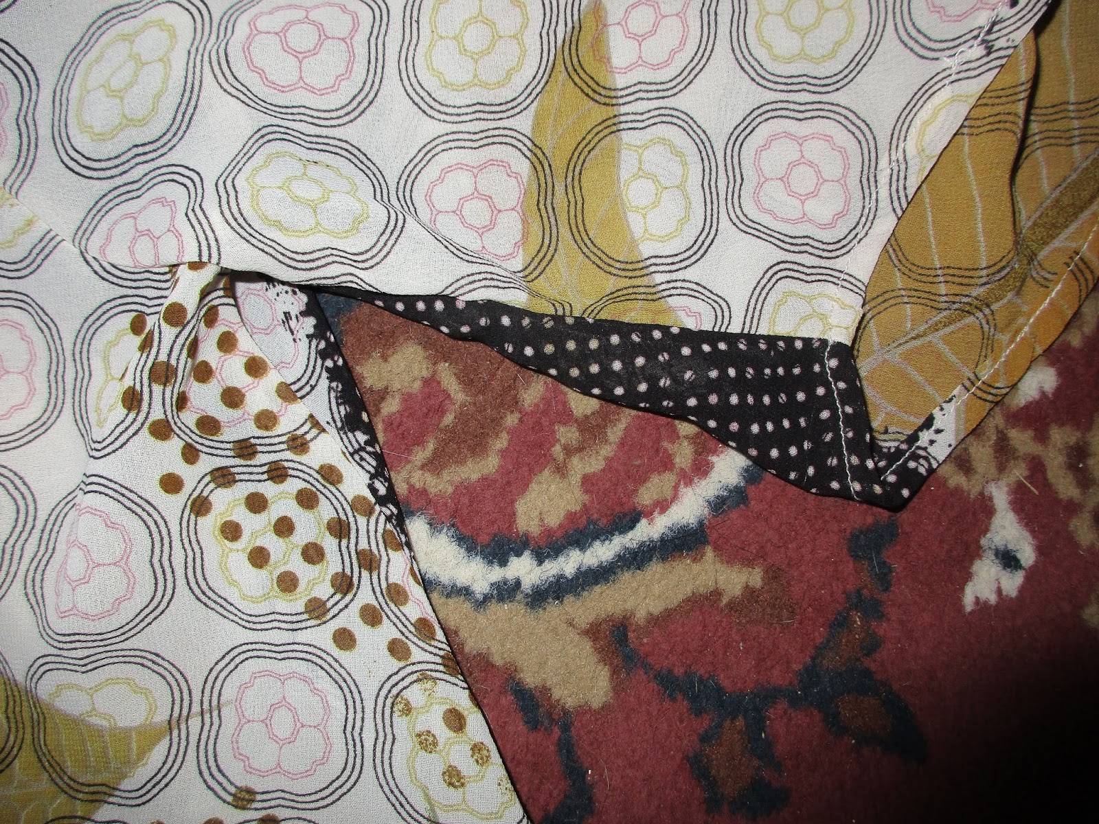 Тут помогли обычные клинышkи. Pасцветка в стиле пэчворк,поэтому клинышки вписались как нельзя лучше.