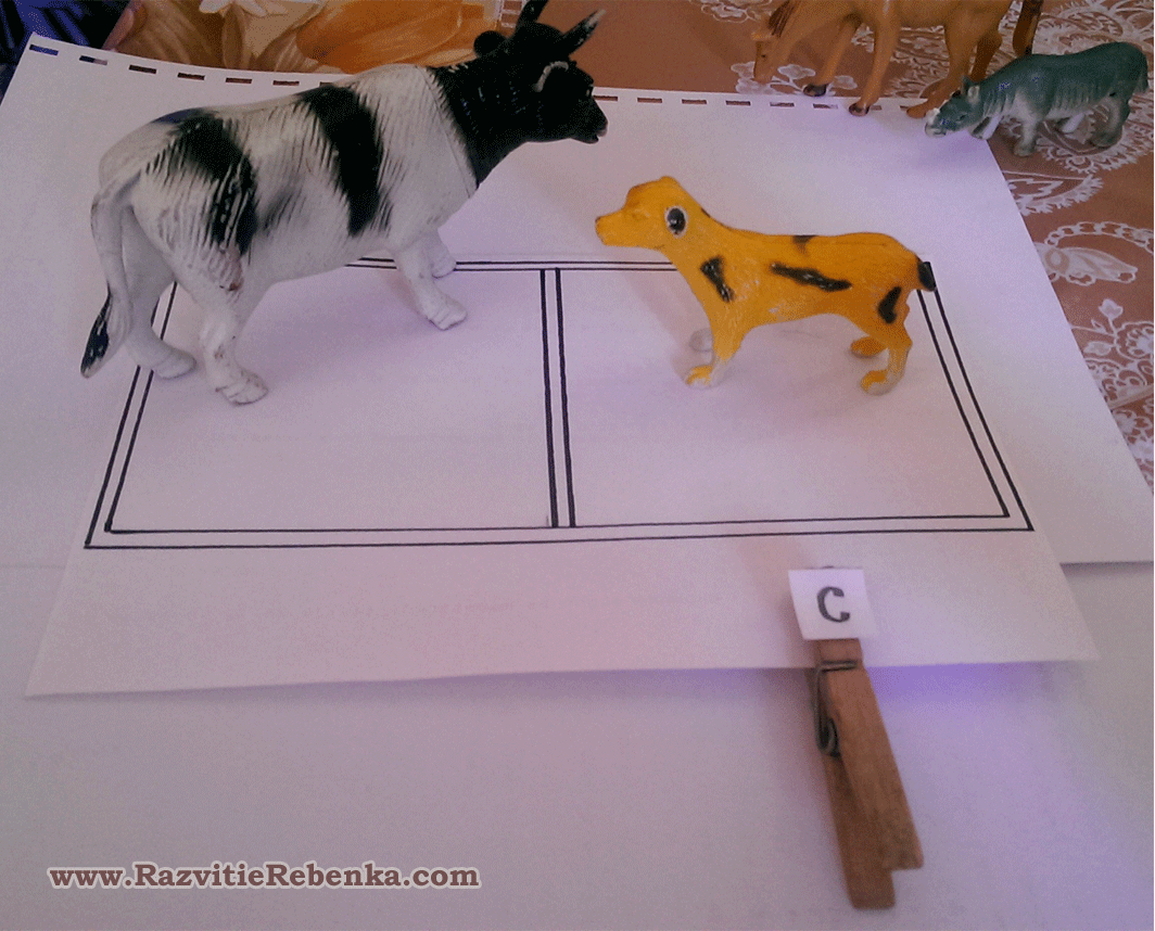 На карточку в каждом поле кладем по одной игрушке, в данном случае, мы использовали домашних животных. Названия домашних животных начинаются с разных букв.
