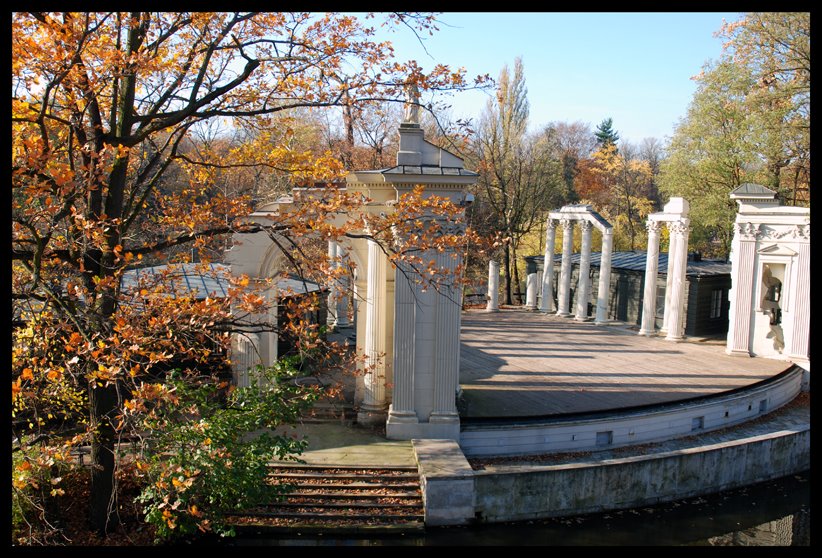 Обращает на себя внимание и прямоугольная выстриженная лужайка, где по краям расцветают кусты роз. Кроме того, на островке Лазенок был построен театр на открытом воздухе со сценой, напоминающий о Древнем Риме. В театральном Померанцевом павильоне находилась когда-то оранжерея (здесь на фресках изображены театралы XVIII века в польских и французских национальных костюмах).