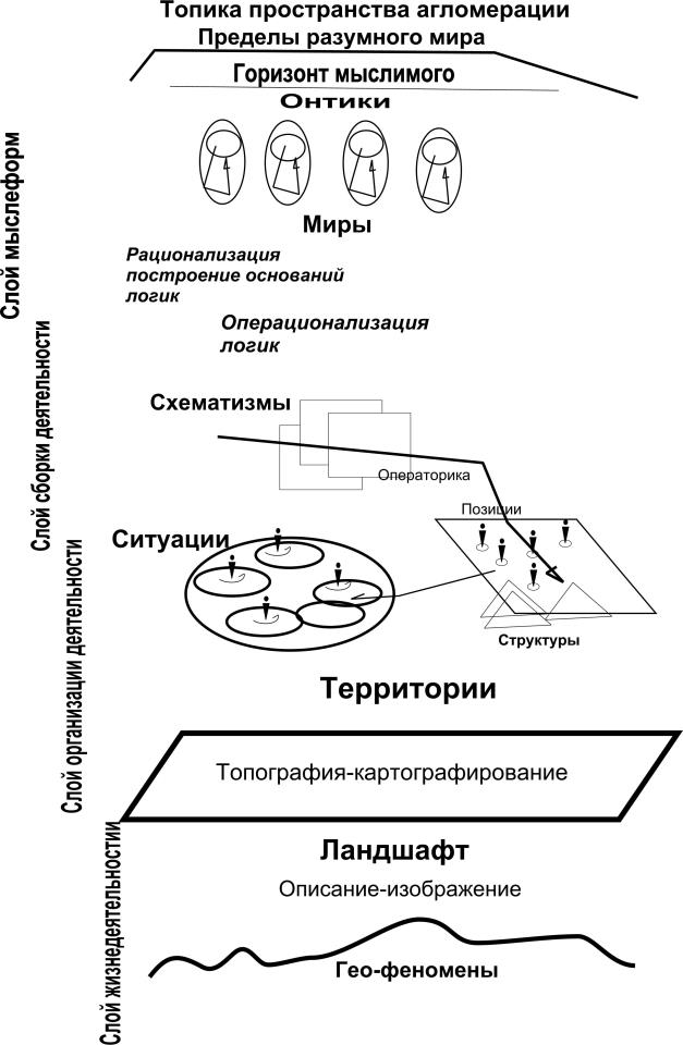 3) Теперь по поводу этого твоего тезиса «… разве мы все не исходим из того, что "конструирующее мышление" это то что принадлежит к деятельности». Я бы здесь сказал так: мы не можем исходить из этого. Мы можем к этому прийти, значит исходить должны из чего то другого. Но можем прийти и к другому онтологическому допущению/полаганию, мы можем прийти к чистому мышлению, например, или к языку. Ведь, мышление, и КМ не исключение, существует не только в деятельности, но и собственно в мышлении, и в языке. Может и еще в чем то. Не пройдя путь онтологизации ответить сразу на этот вопрос нельзя. Одного ответа нет. И формальная онтологизация здесь не поможет.4) А как провести не формальную онтологизацию? Для этого же надо рассмотреть некую проблемную ситуацию, с которой имеет дело именно КМ, а не какое то другое мышление, например, не ТМ. Надо же пройти проблематизацию, работая «внутри» этого мышления, ухватить проблему и разработать идею, как ключ решения ее. И сделать это надо в онтологическом пространстве. Почему там? Потому, что из этого пространства появляется возможность (за счет идеи) запустить процесс управления объективацией. Пока, Миша, тебя в этой группе не было, я предлагал здесь свою схему такой проблематизации. Но история повернулась так, что была схема, но тебя не было. Сейчас ты есть, но схемы нет (на помойке она). Поэтому получится как всегда: по черномырдински.
