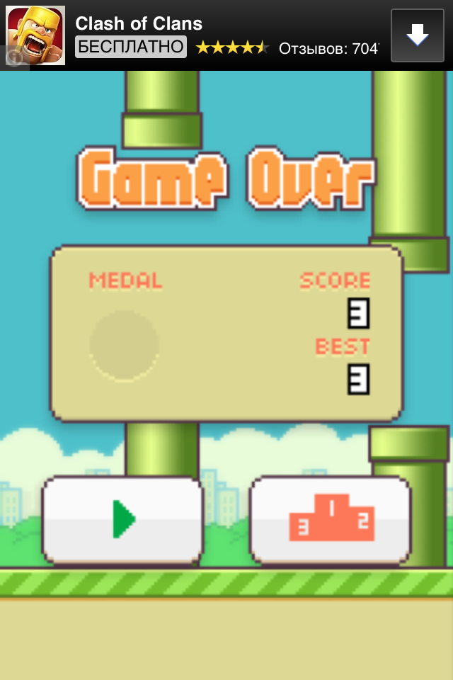И вот тут начинается самое интересное, сделать это не так то уж и просто. Если сказать по правде, до за 10 минут игры мой личный рекорд был всего три трубы.