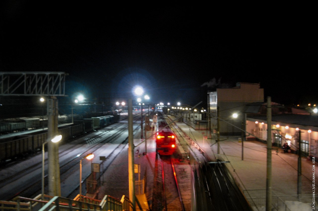 Обратно я ехал на вечернем поезде Егорьевск - Москва. Так как за окном было темно, то фотографировать дальше не стал, да и глазами увидеть что-либо было сложно. Помню только все те же поющие рельсы и глухой лес. Так мы ехали до Ильинского Погоста, где влились в главный ход кольца. Скорости стали быстрее, за окном замелькали встречные грузовые - а тут и Куровская.