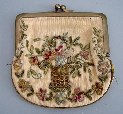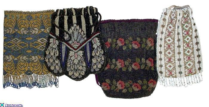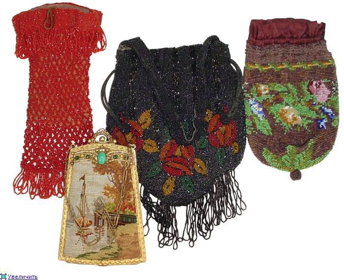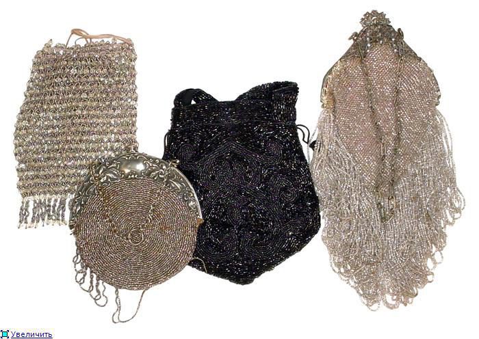 Например, сумочки с бисерным туловом и нитяным узким горлышком замыкались с помощью надетого на горлышко узкого металлического кольца. Изящно выглядели экземпляры в форме кувшинчика: они открывались при перемещении колечка на ручку кувшинчика и замыкались, когда оно надевалось на горлышко. Встречались также сумочки с двумя отделениями, соединенными нитяной сеткой с надетыми на нее двумя колечками, передвижением которых запиралось либо одно, либо оба отделения.