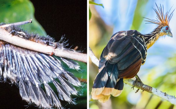 Это гоацин. Вроде бы обычная экзотическая птичка. Но у нее есть уникальная особенность.Ее когти находятся на крыльях.