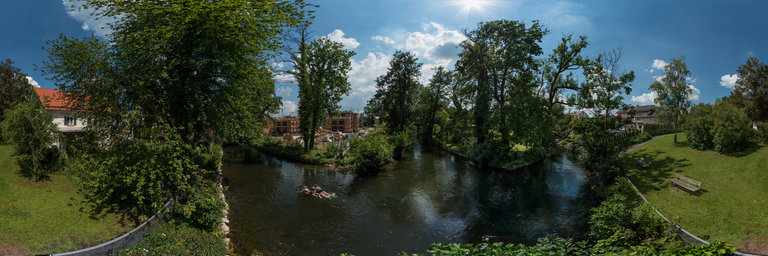 Coming from Lake Starnberg the water of the river W"urm flows through the village Krailling. Smaller bridges definitely encourage people to use their feet or bicycles instead of cars and for that reason a bridge is planned at this place. The two girls ignore that careful consideration and just enjoy drifting with the stream on such a great and hot summer day.