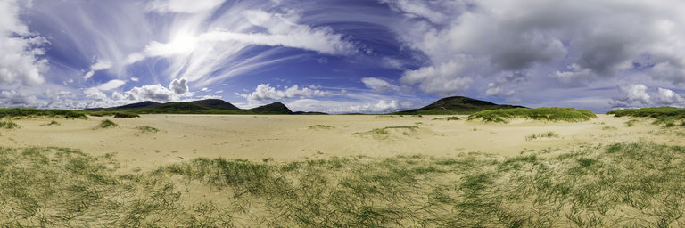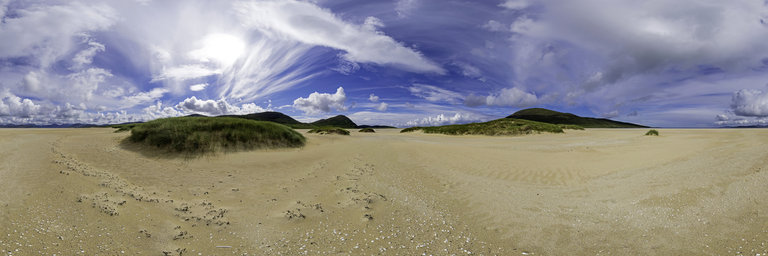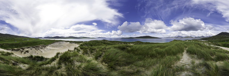 The wide, open expanse of white sands at Scarista on the Isle of Harris is one of the finest beaches in Scotland. The areas of low lying grasses are known as Machair. They are one of the rarest habitats in Europe, found only on the exposed western coasts of Scotland and Ireland.