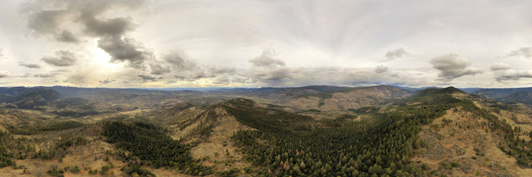 Aerial view 400' above the west ridge off of Heppsie Mountain near Lakecreek, Oregon.  Forested woods on the north sides & a scrub oak savannah on the south slopes.