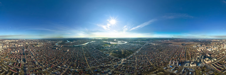 above the Festivalny district in Krasnodar on a sunny day at the very beginning of spring. The corner of the streets of Herzen and Gagarin. The aerial panorama shows the western part of the city of Krasnodar - Krasny Partizan Street, Atarbekova Street, the arboretum of AgroUniversity is visible, Slavyanskiy microdistrict
