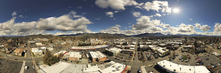 A 150' high aerial view of downtown Grants Pass, Oregon. The county seat of Josephine County, it has a population of 34,533 as of 2010. It was incorporated in 1887 & named after General Ulysses S. Grant's success during the Battle of Vicksburg.