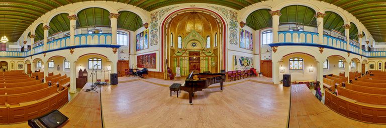 Interior shot of the ornate and renovated Synagogue of Bistrita, Romania, equipped for concerts and musical competitions.