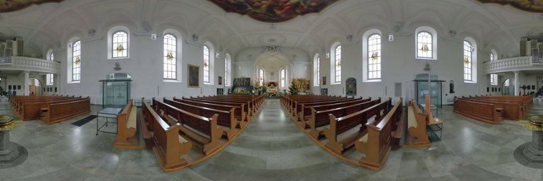 Interior panorama of the catholic church in Meersburg, Baden-Wuerttemberg, Germany. The classic style church consists of 2 parts, the bell tower was originally part of the city's fortification, the nave was rebuilt between 1824 and 1833.