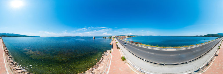 Orbetello is located in the middle of the lagoon and is connected to Monte Argentario by a road built on an artificial dam that divides the sea into Laguna di Levante and Laguna di Ponente. This 360 ° panoramic image was taken along this road. The Spanish mill stands in the water.