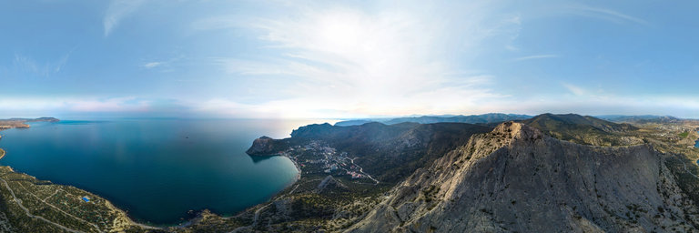 Aerial view near the top of Sokol Mountain between the small Black Sea village of Novyi Svet and the city of Sudak (Eastern Crimea) - an aerial view on a spring day in late April. Black Sea, mountains, with beautiful cliffs