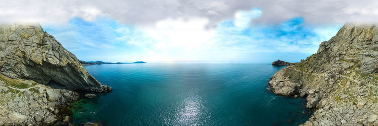 aerial view near the Turtle Head rock in the small Black Sea village Novyi Svit (East Crimea) - aerial view on a spring day in late April. Black Sea, mountains, with beautiful cliffs