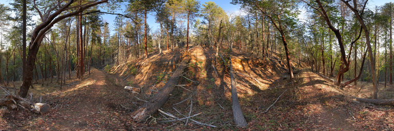 Sterling Ditch was a 26.5 mile long ditch that was three feet deep, constructed by Chinese miners from June to December 1877 as part of the Sterling Mining Company.  Gold was first discovered at Sterling Creek in 1854.  The Sterling Ditch Trail today parallels the old ditch & is located near the ghost town of Buncom, Oregon.  This view is near Tunnel Ridge through a lovely forest setting during evening hours.
