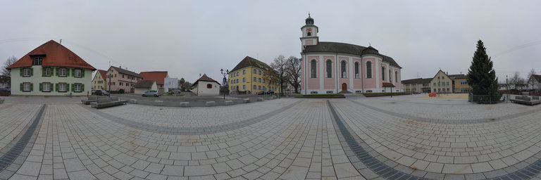 Panorama of the church square in Hilzingen, Baden-Wuerttemberg, Germany. The St Peter and Paul church is a significant example of baroque style village churches in southern Germany.