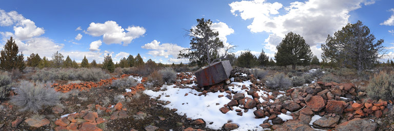 Remains of a former cabin near Six Shooter Pass, California. I don't know any information about this site as it lies just out of sight from a nearby 4wd road. There is also this large water tank that sits atop the rock piles. Remains of silverware, a lock, & plenty of melted glass shows that whatever structure was here was burned down.