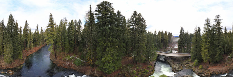 An aerial 50' high view of the Rogue River at Woodruff Bridge north of Prospect, Oregon. One of my favorite areas w/ hiking opportunities, one can see the river funnel through a small canyon.