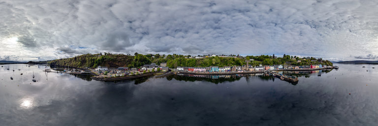 Above the harbour in Tobermory, looking towards the picturesque pastel frontage of the shops and buildings facing seaward. The bright colours and diminuitive scale make this a cheery and welcoming place no matter the weather!Tobermory is the largest town on Mull and as such, a major tourist destination. The Isle of Mull is the second-largest island off the coast of Scotland.