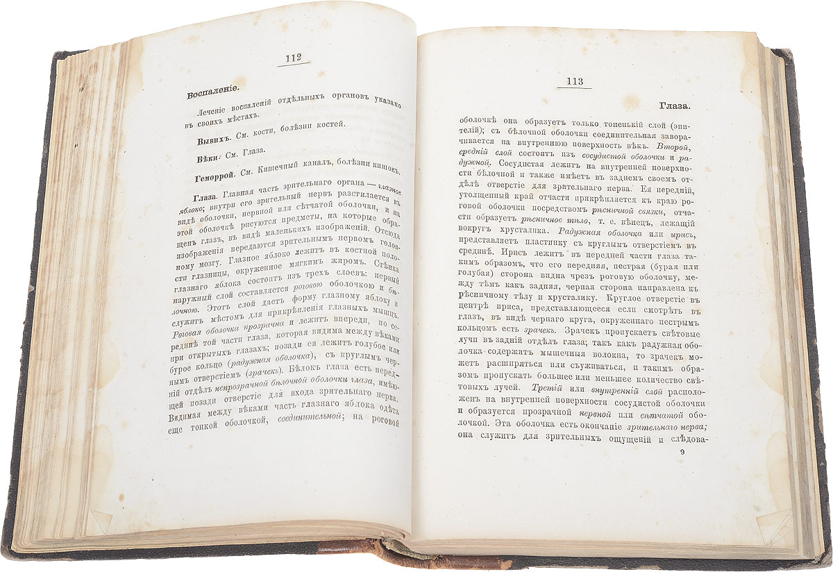 Санкт-Петербург, 1879 год. Типография и литография "Гогенфельден и Ко". Владельческий переплет, кожанный бинтовой корешок с золотым тиснением Сохранность хорошая. Незначительные карандашные пометы в тексте. Четвертое издание составленное и дополненное С.В. Смирновым. Издание содержит каталог болезней, симптомы болезней, применение электро-гомеопатического лечения к каждой болезни, а также краткое анатомическое описание органов человеческого тела в нормальном их состоянии.Издание не подлежит вывозу за пределы Российской Федерации.