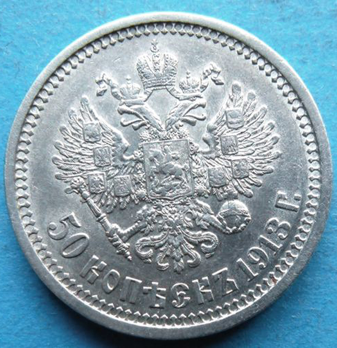 Монета номиналом 50 копеек. Николай II. Санкт-Петербургский монетный двор. Российская империя, 1913 год (ВС). Ag. Вес 10 г, диаметр 2,2 см. Аверс: профильный портрет Николая II, круговая легенда "Б.М.НИКОЛАЙ II ИМПЕРАТОРЪ И САМОДЕРЖЕЦЪ ВСЕРОСС." . Реверс: герб Российской Империи, ниже надпись "50 КОПЕЕКЪ 1913 Г". Гурт с надписью "ЧИСТАГО СЕРЕБРА 2 ЗОЛОТНИКА 10,5 ДОЛЕЙ (В.С)". ВС (Виктор Смирнов) - минцмейстер (управляющий) Санкт-Петербургского монетного двора (1912-1917 гг.). Соотношение осей аверса и реверса: 12. Сохранность очень хорошая (AU).