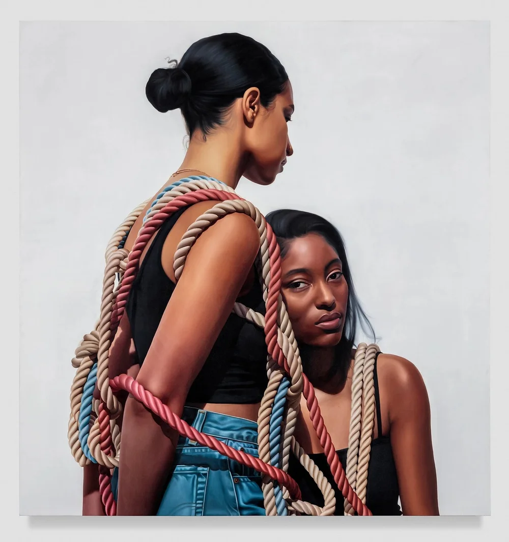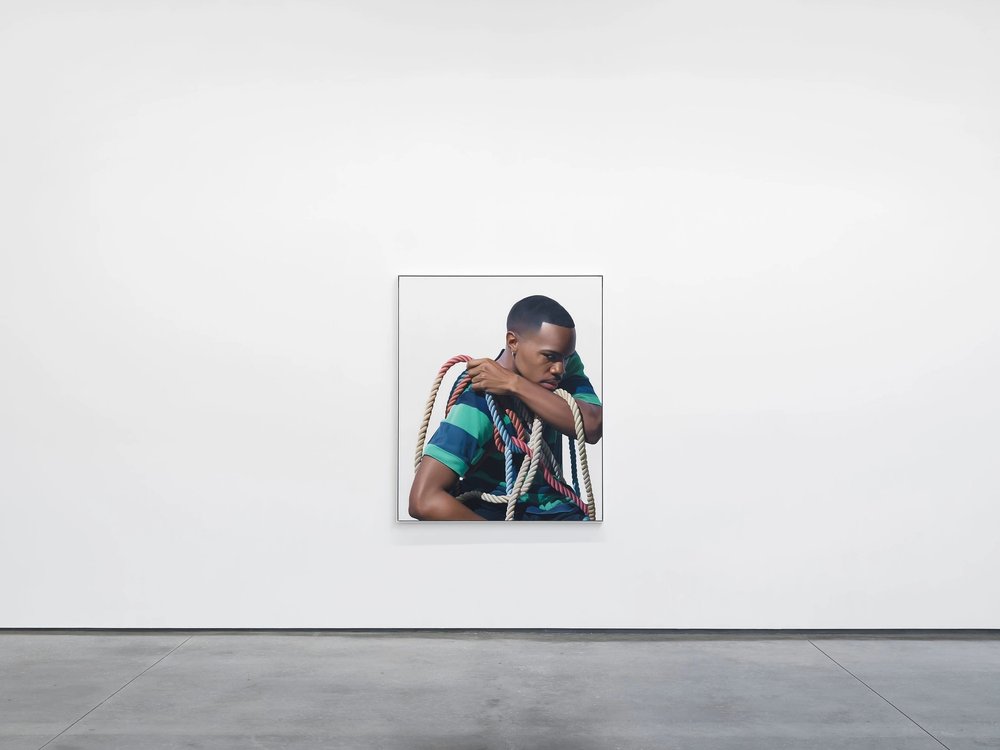 His series "Coalescence" represents a significant shift in Finley’s style. Building upon his fascination with the human figure, he incorporates a rope motif explored in group shows like "Shattered Glass" at Jeffrey Deitch in 2021. For Finley, the ropes symbolise the pleasures and traumas of Black and brown communities in the U.S. They intertwine with history, forming a resilient bond woven into the essence of identity.