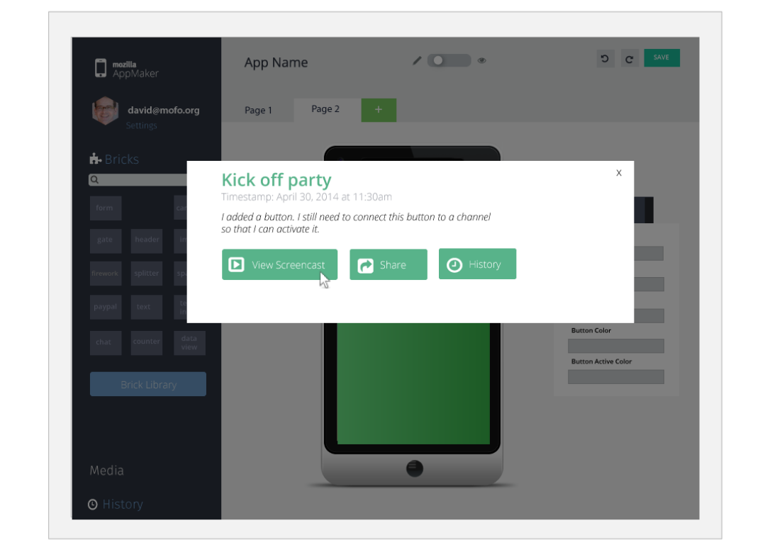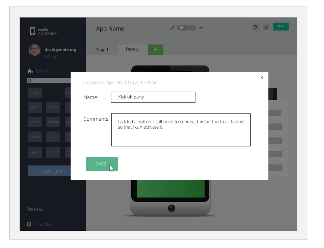 Appmaker history will enable users to raise the value of their (collaborative) making process and learn from their design choices by integrating annotation into a users “save” workflow.