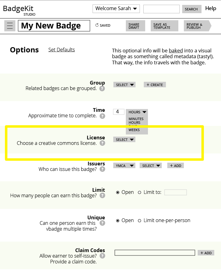 The response from my colleague Michelle Thorne was so strong, I have to add it here: " Please, please, please don't make a new license! It will cause confusion and lack of interoperability. This is more restrictive than all rights reserved. Instead, consider a "badge licensing policy" which suggests how to license and attribute based on existing licensing standards, like Creative Commons."
