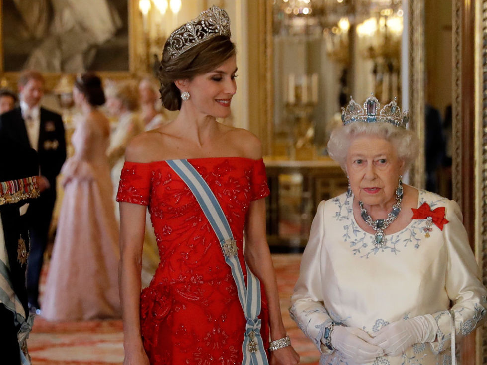 На почетных местах стоят дядя Саша и тетя Минни - император и императрица. Золотое платье тети расшито серебром, а ее голову украшает тиара с настолько огромными сапфирами, что они напоминают глаза. Каскады жемчуга и бриллиантов спускаются с ее шеи до талии. Она единственное, чье платье украшено синим орденом Андрея Первозванного, в то время, как все остальные дамы носят красную екатерининскую ленту.