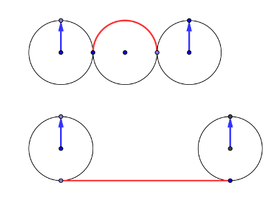 In the bottom figure, the same coin rolls along a straight line. In each case the rolling coin has made one complete rotation. But the red arc at the top is half the length of the red line at the bottom. Why?