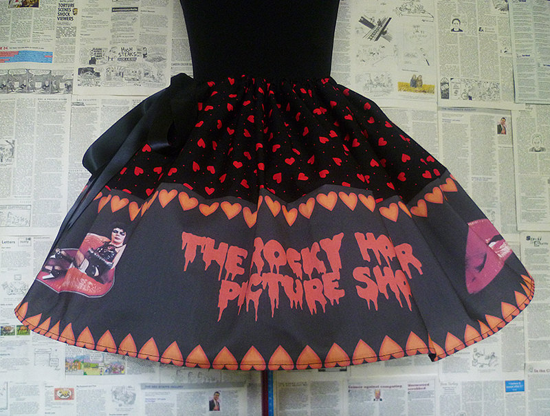 Rooby on the Isle of Wight turns nerdy fabric prints into garments and accessories: Death Star, Walking Dead BEWARE OF ZOMBIES signs, Incredible Hulk blow-up, Rocky Horror, Heroes of Star Wars, antique book-spines, and the first chapter of Harry Potter (which, sadly, is no longer available as a dress).