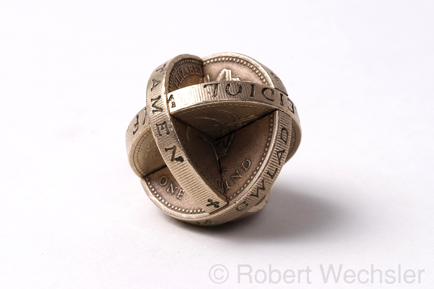 Robert Wechsler makes sculptures by notching and connecting coins to one another to great effect, thanks to the familiarity of the materials and the seeming impossibility of their arrangement.