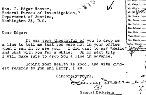 Michael from Muckrock sez, "Few American officials could even come close to the legendary paranoia of J. Edgar Hoover, but that didn't stop the notorious FBI chief from striking up a close friendship with Samuel Dickstein, House Committee on Un-American Activities founder, Supreme Court Justice -- and suspected Russian spy."