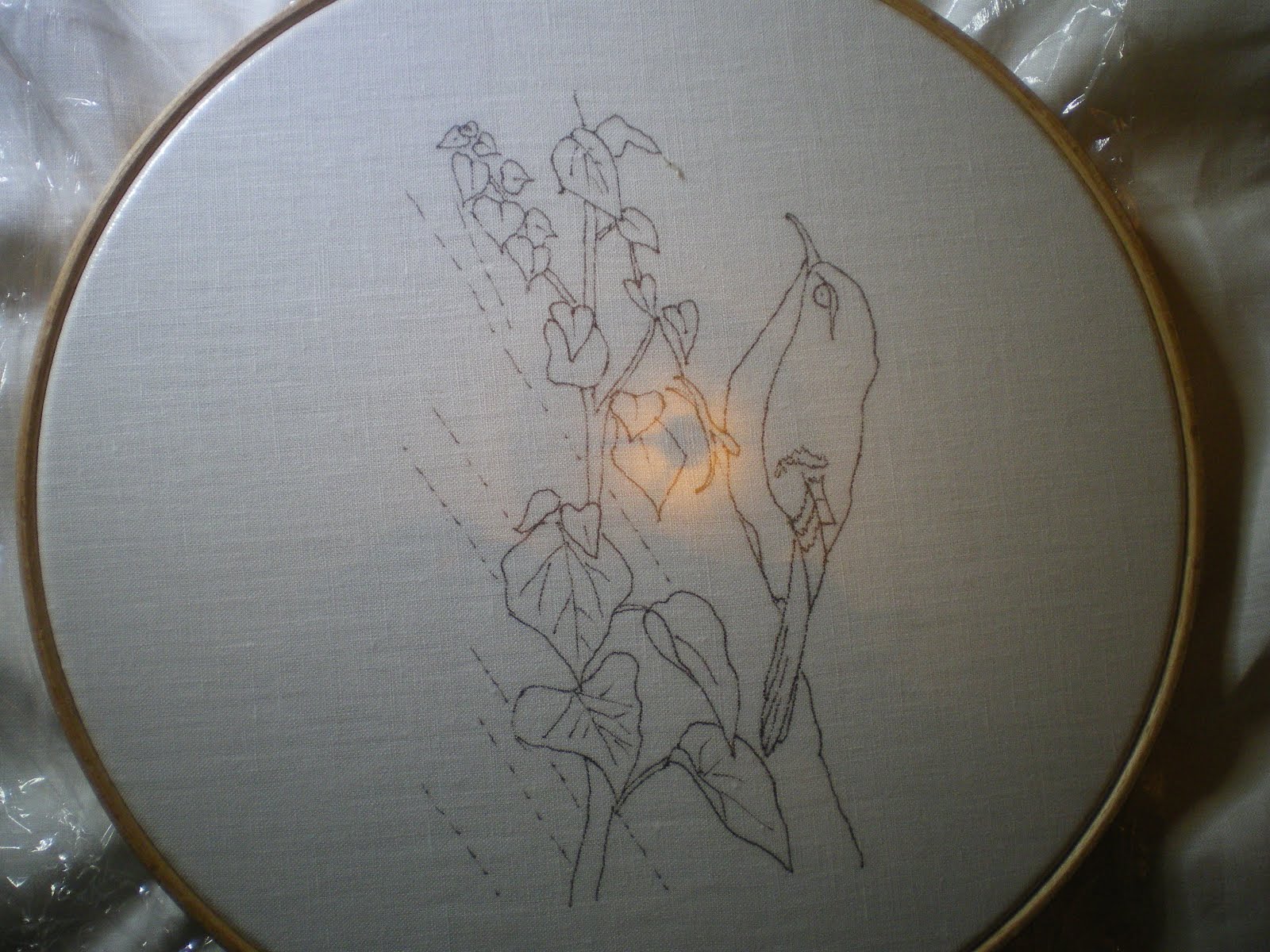 11. Для выполнения верхней части цветка фуксии (рядом с птичкой) я использовала шов ленточный с двойным проколом или двойной ленточный стежок.