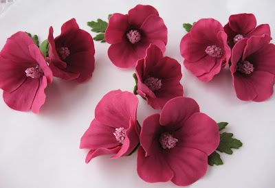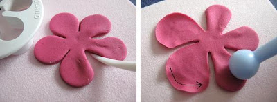 Для распустившихся цветов катаем каплю, на тупом конце капли стеком делаем небольшое отверстие, разрезаем на 5 лепестков и раскатываем лепестки стеком.