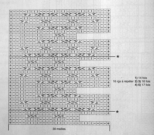 2-й начальный ряд (изн.): Провязать 12 (16, 20, 24) п. жемчужным узором, 1 лиц. п., 2 раза раппорт схемы 5 на 12 п., 2 х раппорт схемы 4 на след. 12 п., 2 х раппорт схемы 3 на след. 20 п., раппорт схемы 2 на 18 п., раппорт схемы 1 на 18 п., 4 (6, 8, 10) п. жемчужным узором.