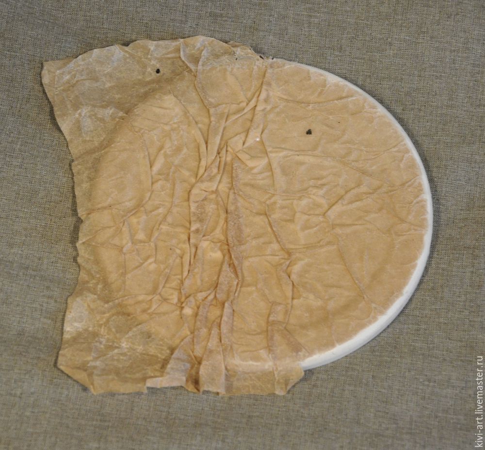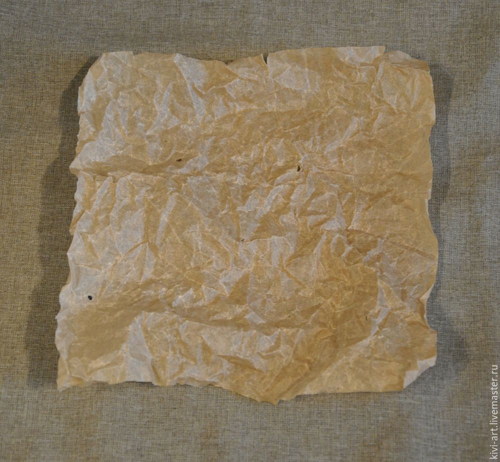 Началась работа с крафт-бумаги. Её я смяла в комок, а потом расправила. На бумаге остались неровности и заломы.
