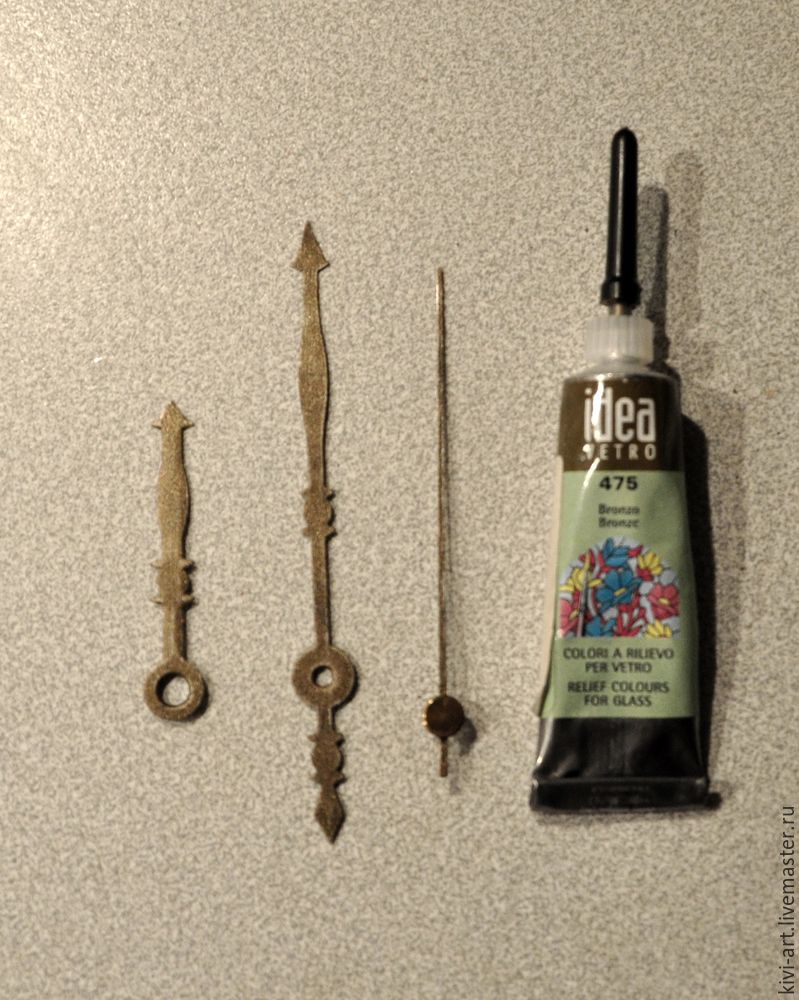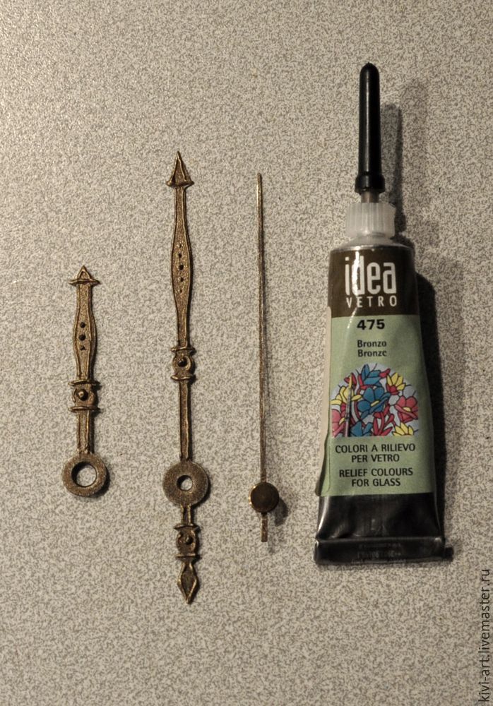 Окрасила стрелки я контурной пастой. Во-первых, потому, что у неё лучшее сцепление с поверхностью, а, во-вторых, для того, чтобы цвет на самой работе точно совпал с цветом стрелок.