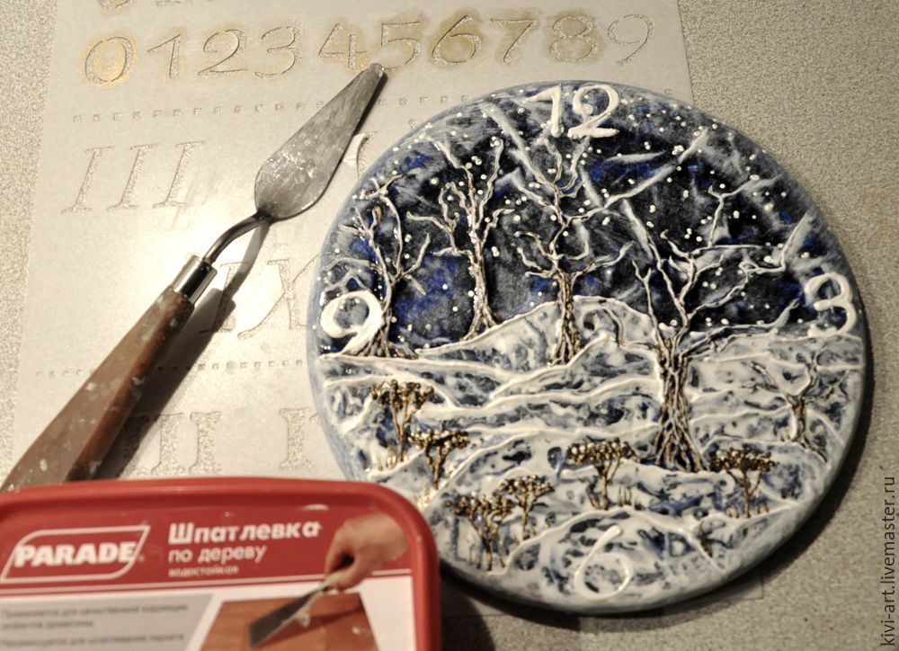 Вот такое получилось панно... Но я не люблю непрактичные вещи:) Поэтому я сразу была настроена сделать из этой заготовки часы. А часы — это циферблат. Его я решила заменить объемными самодельными цифрами.